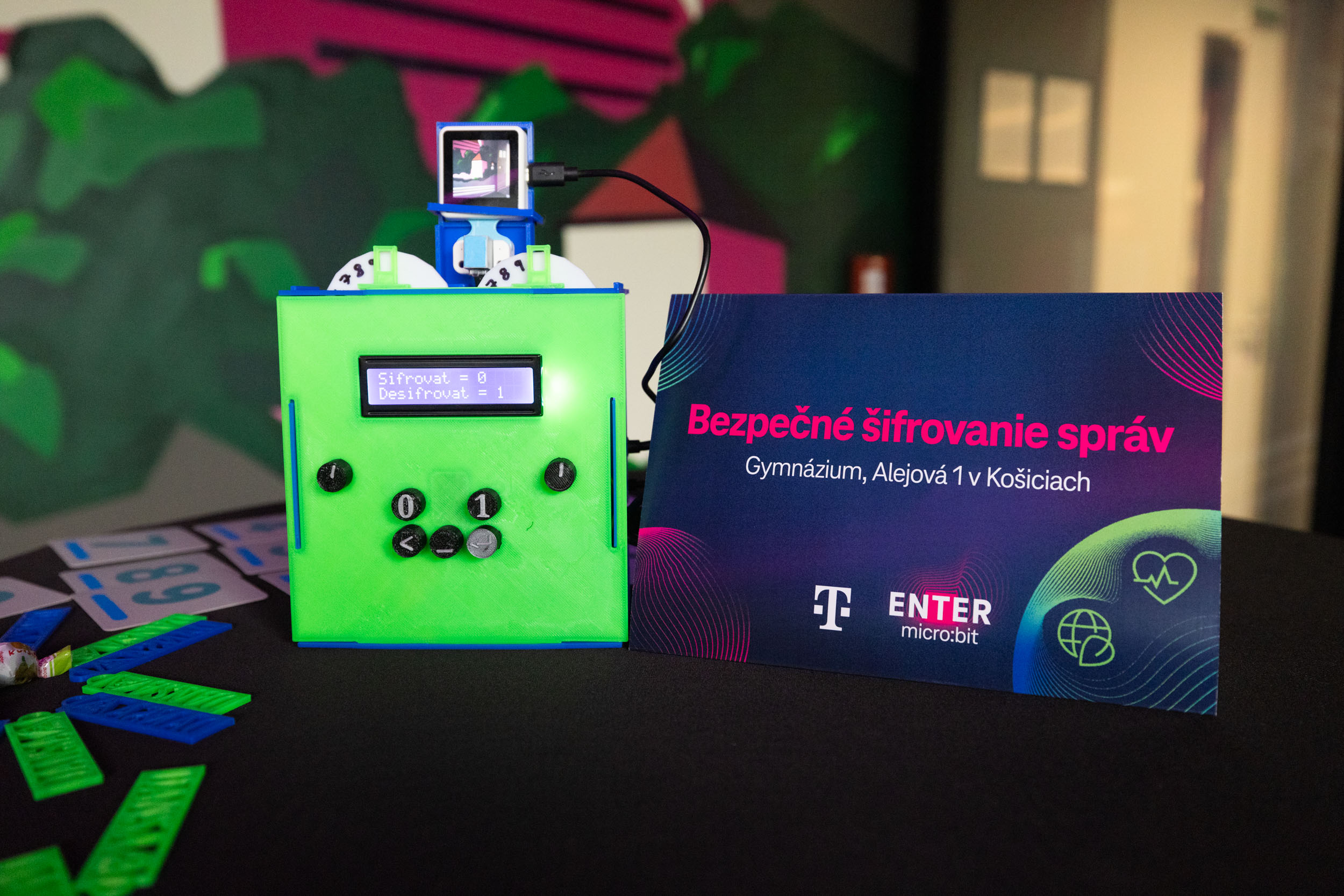 Prvé miesto si vyslúžil tím Dansa z Gymnázia, Alejová 1, Košice s projektom MicroEnigma, Ide o šifrovacie zariadenie, ktoré učí užívateľov pochopiť kódovanie znakov a šifrovanie slov prostredníctvom hry a výziev. Toto zariadenie zabezpečuje, že iba osoby so správnym dešifrovacím kľúčom môžu čítať pôvodný text, čím chráni dôležité informácie a súkromie pred neoprávneným prístupom. Komisiu zaujal svojim nápadom, inovatívnosťou, podrobným návodom na realizáciu a najmä programovacími schopnosťami členov tímu.